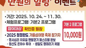 2025 청정완도 가을 섬 여행 축제, 해양치유로 힐링 체험 완도해양치유센터가 10월 24일부터 26일까지 개최되는 ‘2025 청정완도 가을 섬 여행 축제’와 연계하여 해양치유 프로그램을 누구나 부담없이 즐길 수 있는 특별 이벤트 ‘만원의 힐링’을 진행한다고 16일 밝혔다. 이번 행사는 ‘완도왔섬 치유됐섬’ 슬로건 아래, 완도를 찾는 관광객에게 가을 섬 여행의 감성과 해양치유의 힐링을 함께 즐길 수 있는 해양치유 체험 이벤트로 마련되었다. ‘만원의 힐링’ 이벤트는 가을 섬 여행 축제 프로그램인 ▲ 제2회 명사십리 치유길 맨발걷기 페스티벌 ▲ 청산도 은하수 투어 ▲ 생일도 멍때리기 체험 참가자에게 완도해양치유센터 기본2 프로그램을 1만원으로 1회 체험할 수 있는 특별 프로그램이다. 참가자는 완도해양치유센터의 대표적인 프로그램인 딸라소풀, 해수 미스트 테라피, 해조류 거품 테라피, 머드 테라피를 즐길 수 있다. 이벤트는 10월 24일부터 11월 30일까지 진행된다. 축제 기간 동안, 완도읍 해변공원 일원에서는 가족단위 방문객을 위한 뷰티살롱, 마술․버블, 완도호랑가시나무 동화 속 여행, 버스킹 등 다채로운 행사가 펼쳐지며 특히 ‘완도해양치유 홍보관’에서는 ‘해양치유 힐링 한컷’ 즉석사진 인화 서비스로 가을 섬 여행 추억을 선사할 예정이다. 신우철 완도군수는 “완도의 가을 섬은 그 자체로 힐링”이라며 “더 많은 분들이 가을 섬을 여행하시고, 해양치유로 휴식과 회복의 시간을 누리시기를 바란다”고 전했다.